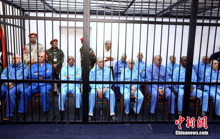 当地时间2014年11月16日,利比亚的黎波里,卡扎菲时期前情报局长阿卜杜拉·塞努希(左三)出庭受审。37名卡扎菲政权官员出庭受审。他们被指控犯有谋杀、绑架、共谋煽动强奸、掠夺、破坏、挪用公共基金和危害国家统一等罪名。