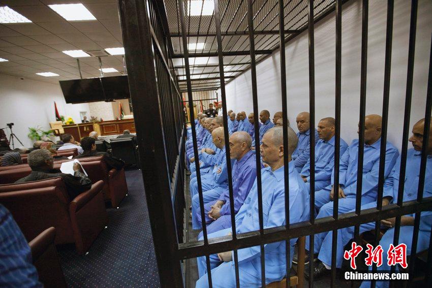 当地时间2014年11月16日,利比亚的黎波里,卡扎菲时期前情报局长阿卜杜拉·塞努希(左三)出庭受审。37名卡扎菲政权官员出庭受审。他们被指控犯有谋杀、绑架、共谋煽动强奸、掠夺、破坏、挪用公共基金和危害国家统一等罪名。