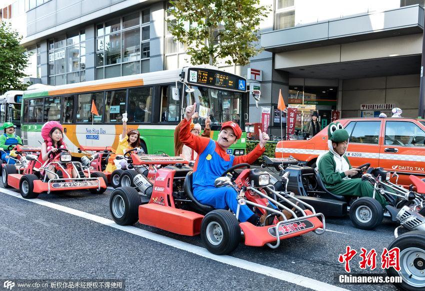 当地时间2014年11月16日,日本东京,一项马里奥卡丁车活动在东京举行,参与者驾驶租赁的卡丁车在公共街道行驶。他们身着超级玛丽游戏中的人物服饰,驾驶着卡丁车在街道上与其他车辆同行,每到一处都吸引了大批行人上前拍照。