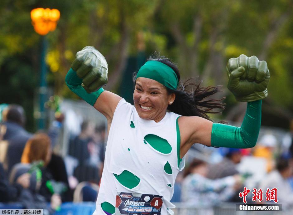 当地时间11月16日,美国加利福尼亚州阿纳海姆的迪斯尼乐园,“复仇者联盟”半程马拉松赛开跑。图为装扮成绿巨人的参赛选手。