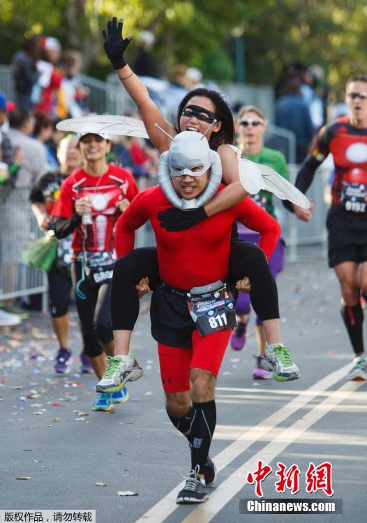 当地时间11月16日,美国加利福尼亚州阿纳海姆的迪斯尼乐园,“复仇者联盟”半程马拉松赛开跑。图为装扮成蚁人的选手,身背变装为黄蜂女的女友。