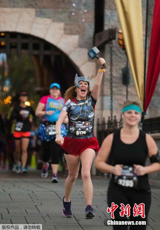 当地时间11月16日,美国加利福尼亚州阿纳海姆的迪斯尼乐园,“复仇者联盟”半程马拉松赛开跑。图为装扮为雷神托尔的参赛选手。