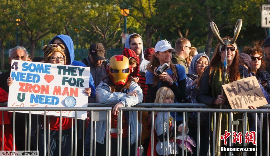 当地时间11月16日,美国加利福尼亚州阿纳海姆的迪斯尼乐园,“复仇者联盟”半程马拉松赛开跑。图为在等候在终点线的观众。