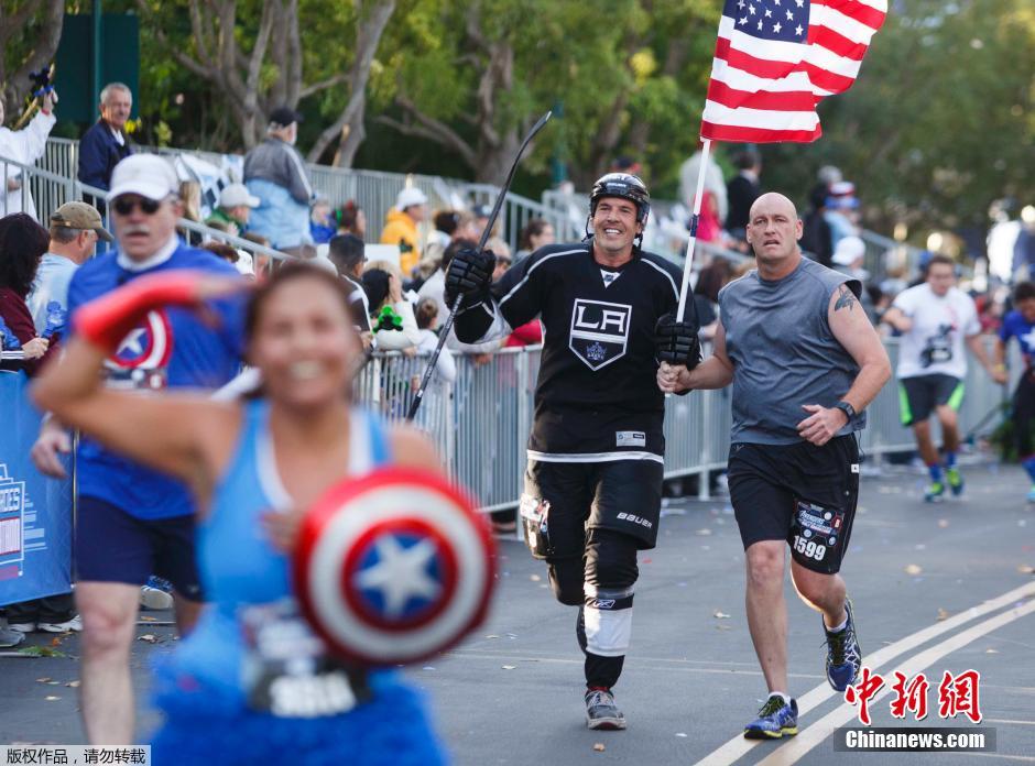 当地时间11月16日,美国加利福尼亚州阿纳海姆的迪斯尼乐园,“复仇者联盟”半程马拉松赛开跑。图为身穿冰球队服以及装扮成美国队长的参赛者。