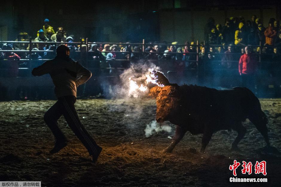 当地时间2014年11月16日,西班牙梅地纳塞利,传统“火牛节”活动举行。“火牛节”是西班牙东部地区的传统节日庆典活动,在活动中公牛的犄角被绑上火把或是涂上一层可燃物质后点燃,再将牛释放满场飞奔,狂欢者则奔跑躲,场面惊险刺激。
