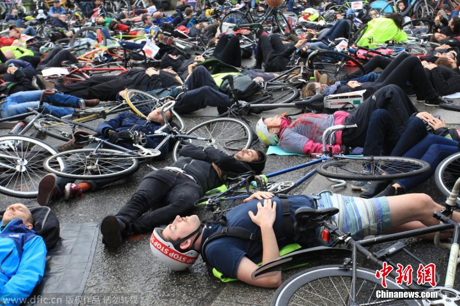 当地时间2014年11月15日,英国伦敦,民众为交通事故死难者举办“模拟葬礼”,并“躺尸”街头参加示威活动,抗议国家运输体系和居高不下的交通事故死亡率。