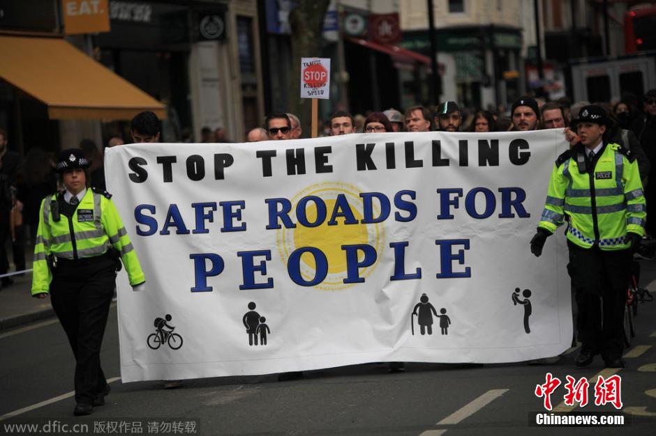 当地时间2014年11月15日,英国伦敦,民众为交通事故死难者举办“模拟葬礼”,并“躺尸”街头参加示威活动,抗议国家运输体系和居高不下的交通事故死亡率。