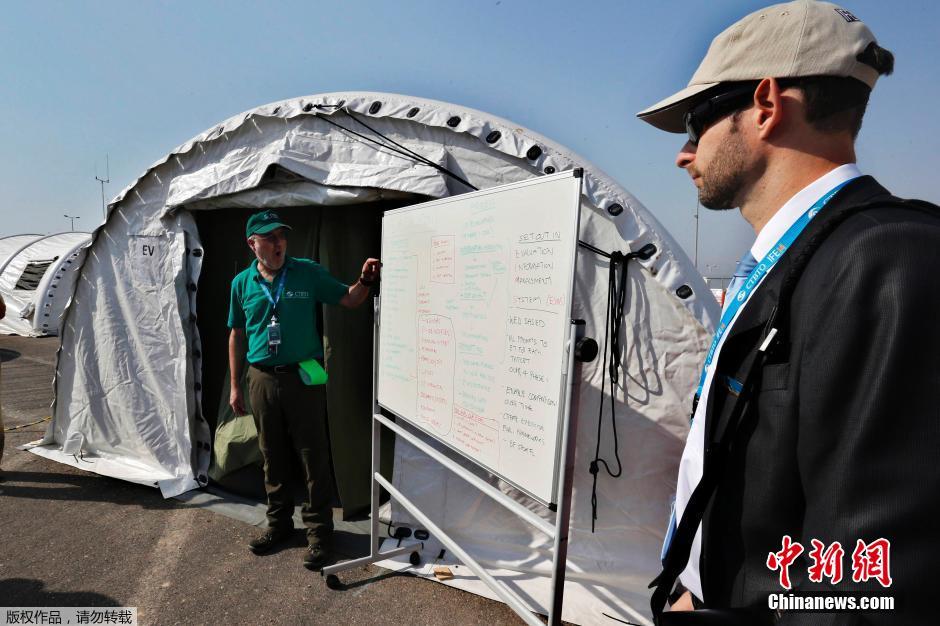当地时间2014年11月16日,约旦死海,当地举行防核反恐演练,来自全面禁止核试验条约的工作人员在演练现场进行排查。