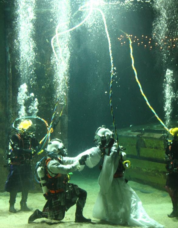 中新网11月26日电 据外媒报道,在苏格兰威廉堡的“水底世界”,37岁女潜水员班科夫斯卡(Dorota Bankowska)与大她两岁的丈夫阿博特(James Abbott)在4米深的潜水缸内举行了一场水下婚礼。