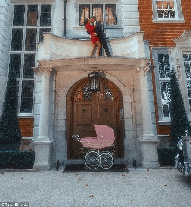 塔玛拉在7千万美元豪宅的前门门台上,与丈夫摆pose接吻,门口是女儿Sophia的婴儿车。(网页截图)