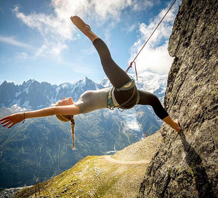 据英国《每日邮报》11月25日报道,来自法国沙莫尼(Chamonix)的美女舞蹈教师、模特阿加特·彼得里尼(Agathe Petrini)在悬崖峭壁间练习舞功挑战重力,摄影师亚历克斯·布塞抓拍到其一系列令人感到惊心动魄的照片。彼得里尼腰间系着绳索,一只脚撑在离地面数百米的悬崖上,另一只脚伸向空中,同时优雅地伸出手,完成了一系列高难度舞蹈动作,令人瞠目。但是这种反重力姿态只是彼得里尼诸多惊人动作中的一部分,她还曾在高山顶上腾空拍照,甚至悬挂于悬崖边、在绝壁上表演杂技。图片来源:国际在线