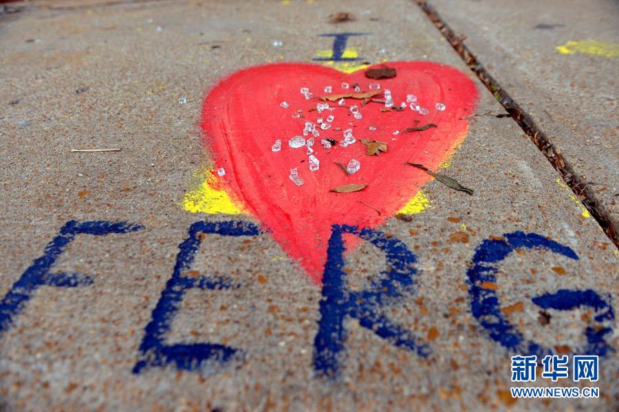 11月26日,在美国密苏里州弗格森,一家店铺窗户被打碎,玻璃落在写着“我爱弗格森”的地上。美国密苏里州圣路易斯县大陪审团24日晚决定不对枪杀非洲裔青年迈克尔·布朗的白人警察达伦·威尔逊进行起诉,在弗格森地区引发包括枪击、抢劫、纵火在内的暴力骚乱。许多店铺关门不营业,另外一些店铺在打砸抢中受损,用厚厚的木板替代被打碎的玻璃窗,街上行人寥寥无几。感恩节将至,连日的骚乱让弗格森没有丝毫节日的气氛。新华社记者 殷博古 摄