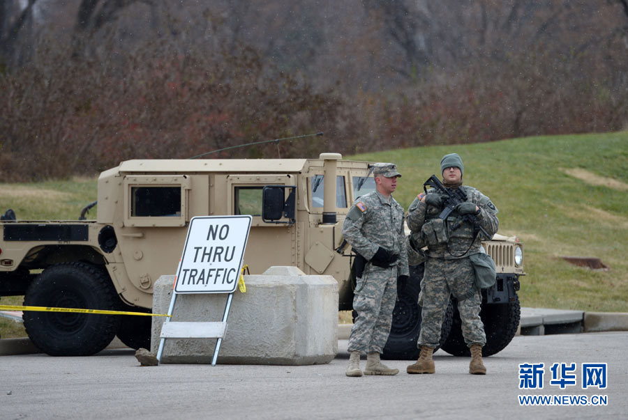 11月26日,在美国密苏里州弗格森,国民警卫队士兵封锁通往迈克尔·布朗被枪杀地点的道路。美国密苏里州圣路易斯县大陪审团24日晚决定不对枪杀非洲裔青年迈克尔·布朗的白人警察达伦·威尔逊进行起诉,在弗格森地区引发包括枪击、抢劫、纵火在内的暴力骚乱。许多店铺关门不营业,另外一些店铺在打砸抢中受损,用厚厚的木板替代被打碎的玻璃窗,街上行人寥寥无几。感恩节将至,连日的骚乱让弗格森没有丝毫节日的气氛。新华社记者 殷博古 摄