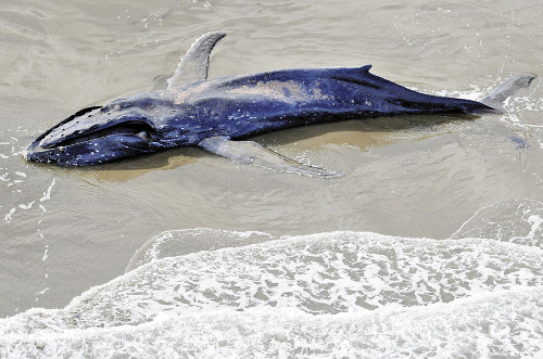 被冲上海水浴场的座头鲸尸体。