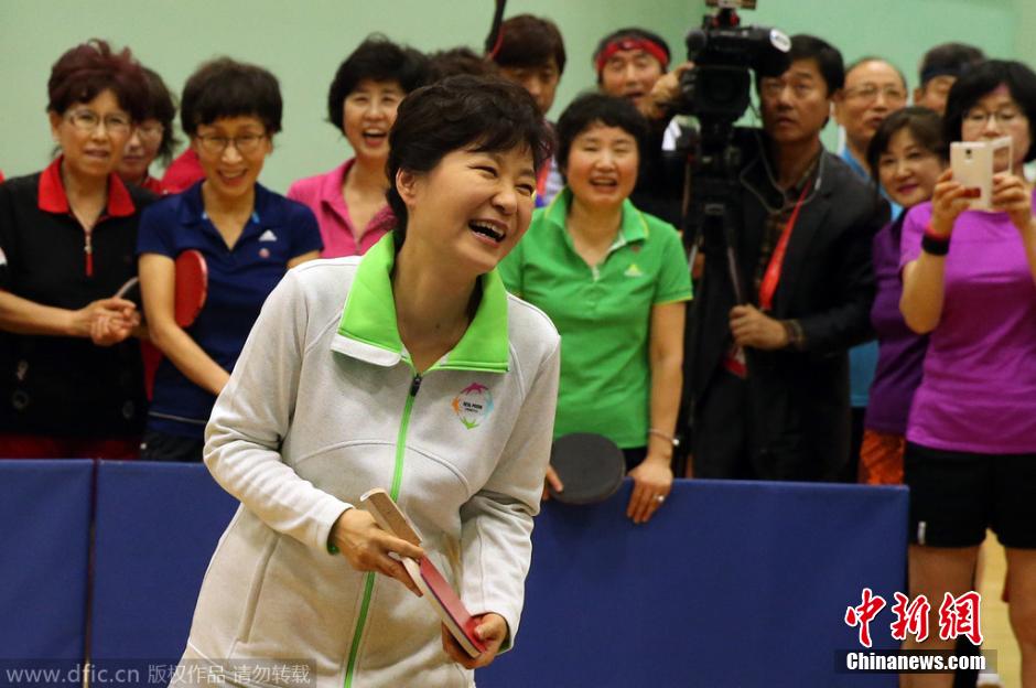 当地时间2014年11月26日,韩国首尔,韩国总统朴槿惠参加在首尔奥林匹克公园体操竞技场举行的“文化之日活动”,并与市民一起打乒乓球。