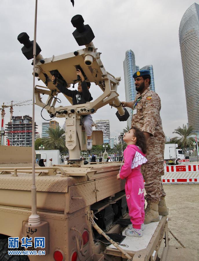 12月1日,在阿拉伯联合酋长国首都阿布扎比海滨大道,两名阿联酋儿童在阿联酋军人的陪同下观看展示的武器装备。为庆祝阿联酋建国43周年,阿联酋武装部队12月1日在阿布扎比海滨大道举行军力展示,对民众进行国防教育。阿联酋陆海空三军的坦克、自行火炮、水陆两栖装甲车、步兵火力突击车、“拜努纳”级轻型护卫舰、F-16战斗机等进行了动态演示,静态展示区还展示了防空导弹、雷达、各种火炮和军用车辆等。新华社记者安江摄