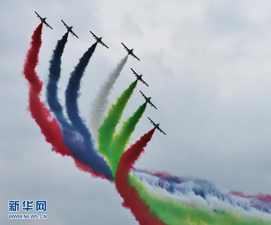 12月1日,在阿拉伯联合酋长国首都阿布扎比海滨大道上空,阿联酋空军“骑士”飞行表演队进行飞行表演。为庆祝阿联酋建国43周年,阿联酋武装部队12月1日在阿布扎比海滨大道举行军力展示,对民众进行国防教育。阿联酋陆海空三军的坦克、自行火炮、水陆两栖装甲车、步兵火力突击车、“拜努纳”级轻型护卫舰、F-16战斗机等进行了动态演示,静态展示区还展示了防空导弹、雷达、各种火炮和军用车辆等。新华社记者安江摄