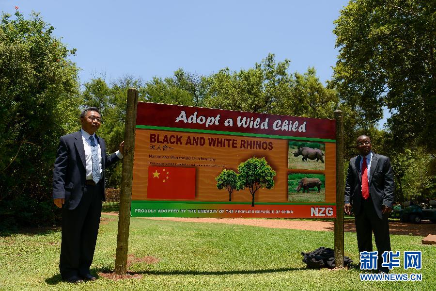 12月3日,在比勒陀利亚南非国家动物园,中国驻南非大使馆临时代办杨义瑞(左)与南非国家动物园总经理恩克索马尼为保护犀牛活动揭牌。中国驻南非大使馆当日在比勒陀利亚南非国家动物园认养五头犀牛和两只小熊猫,并在动物园犀牛馆前举行保护犀牛活动揭牌仪式。新华社记者翟健岚摄
