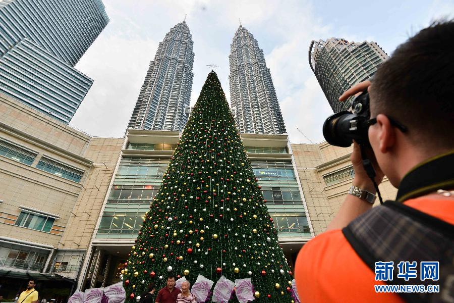 马来西亚阳光广场为配合圣诞节的到来,经过长达9个星期时间,在吉隆坡双子塔前特别制作了一棵高32米的圣诞树,吸引众多游客驻足观赏拍照。这棵圣诞树被马来西亚记录大全认证为“马来西亚最高的圣诞树”。新华社发(张纹综摄)