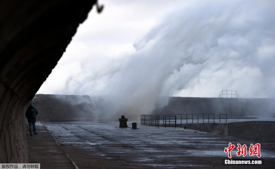 当地时间2014年12月10日,英国Cumbia,巨浪拍打着 Whitehaven码头。英国气象局发布警告,称在大西洋上空急速发展的“气象炸弹”将袭击英国,这一风暴将给英国西北部沿海地区带来大风与“异常高”的巨浪。由于风暴的影响,轮渡与多个列车服务已经被取消,苏格兰地区所有学校和托儿所已经关闭。