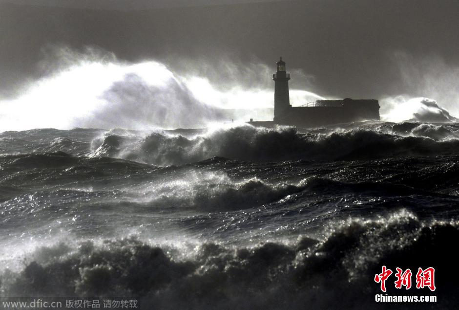 当地时间2014年12月10日,英国Cumbia,巨浪拍打着 Whitehaven码头。英国气象局发布警告,称在大西洋上空急速发展的“气象炸弹”将袭击英国,这一风暴将给英国西北部沿海地区带来大风与“异常高”的巨浪。由于风暴的影响,轮渡与多个列车服务已经被取消,苏格兰地区所有学校和托儿所已经关闭。图片来源:东方IC 版权作品 请勿转载