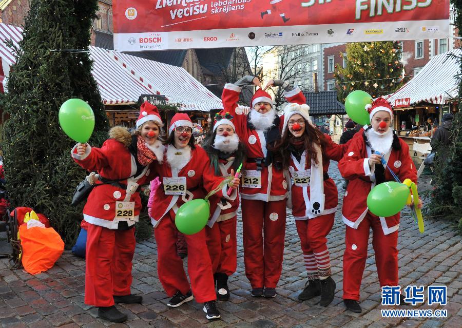 12月14日,在拉脱维亚里加,参加圣诞老人慈善募捐环城赛跑活动的市民在起点合影。当日,200多名扮成圣诞老人的市民在拉脱维亚首都里加参加了传统的“圣诞老人”慈善募捐环城赛跑活动。此次活动将为20名重病儿童募捐1.2万欧元。 新华社记者郭群摄