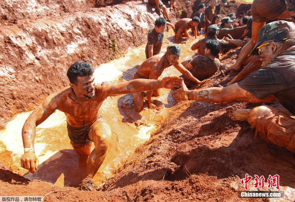 当地时间2014年12月14日,泰国南部呵叻城,当地举办慈善泥浆赛跑,参赛者在淤泥中摸爬滚打。