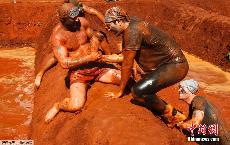 当地时间2014年12月14日,泰国南部呵叻城,当地举办慈善泥浆赛跑,参赛者在淤泥中摸爬滚打。