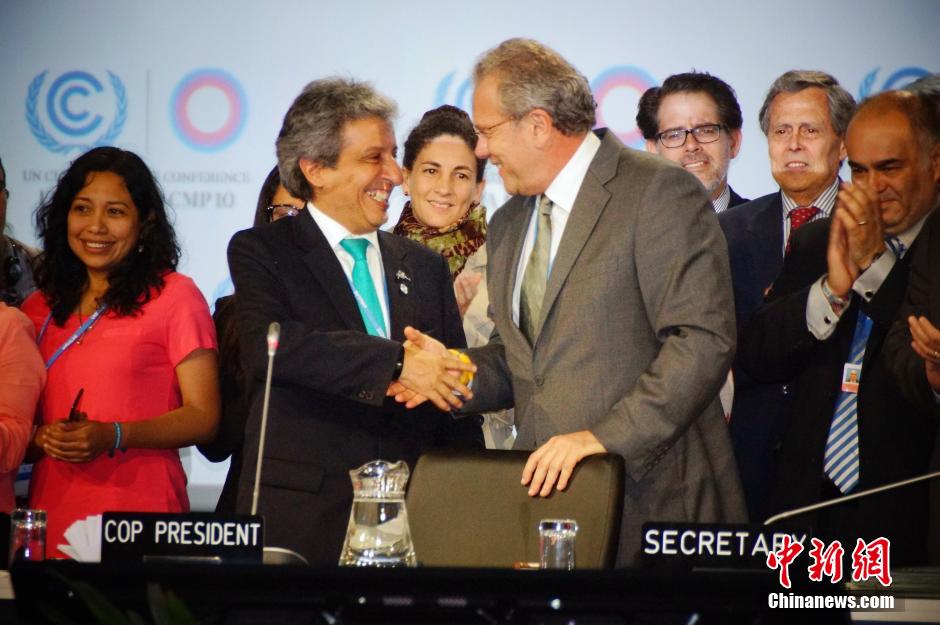 12月14日凌晨,经过13天密集磋商,一年一度的联合国气候变化会议在加时32个小时后,在秘鲁首都利马闭幕。闭幕大会上,利马气候大会主席比达尔向东道国秘鲁代表团团长对会议成果举办表示祝贺。(翻拍现场屏幕)中新社发 彭大伟 摄