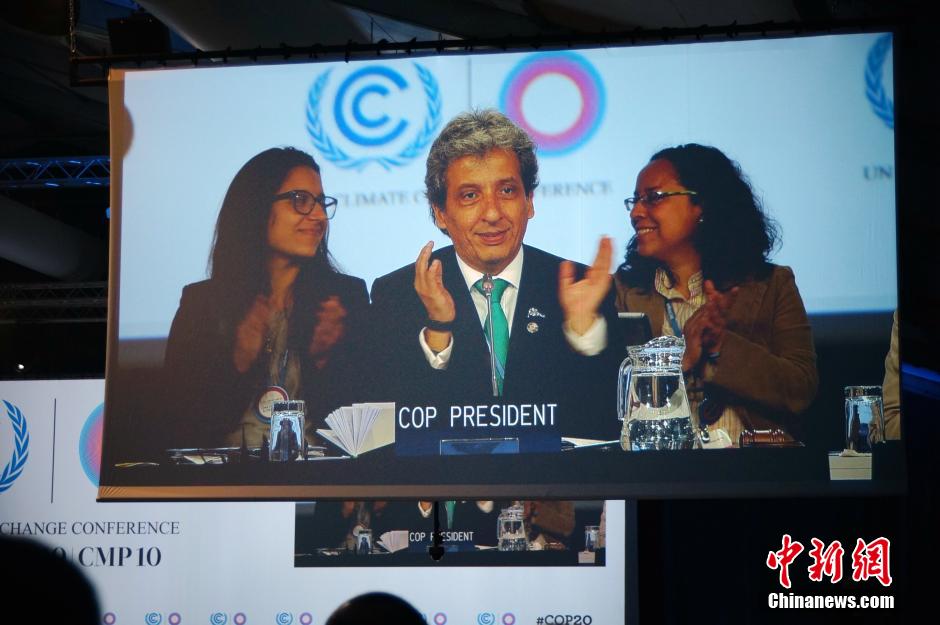 12月14日凌晨,经过13天密集磋商,一年一度的联合国气候变化会议在加时32个小时后,在秘鲁首都利马闭幕。(翻拍现场屏幕)中新社发 彭大伟 摄