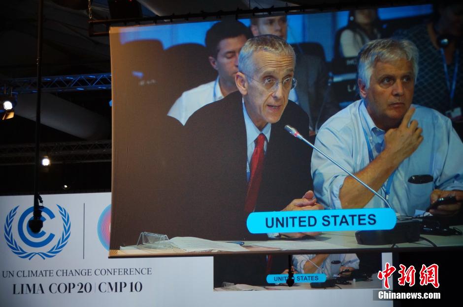 12月14日凌晨,经过13天密集磋商,一年一度的联合国气候变化会议在加时32个小时后,在秘鲁首都利马闭幕。美国气候问题特使斯特恩在闭幕式上对大会主席的贡献表示感谢。(翻拍现场屏幕)中新社发 彭大伟 摄