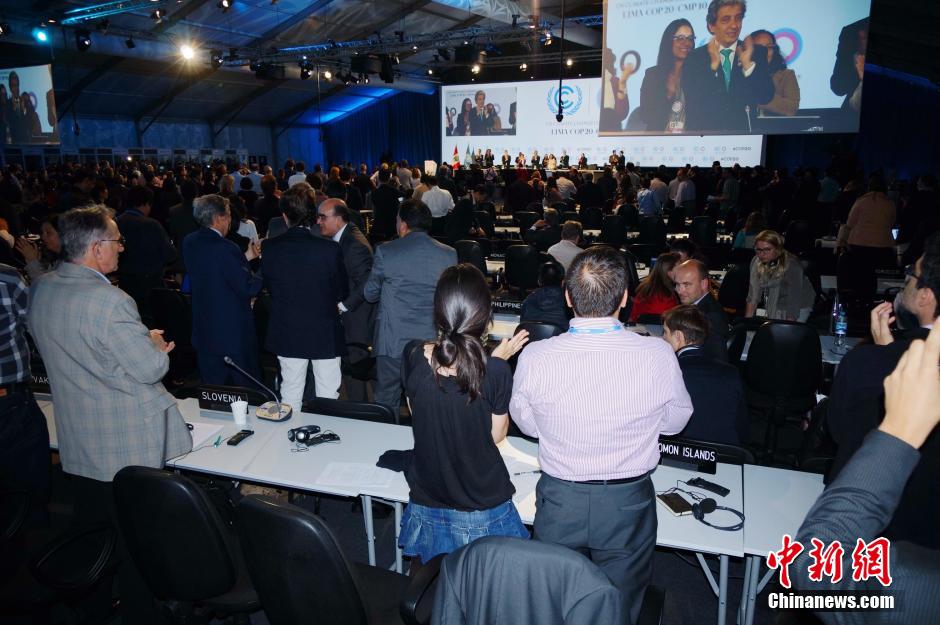 12月14日凌晨,经过13天密集磋商,一年一度的联合国气候变化会议在加时32个小时后,在秘鲁首都利马闭幕。当日,大会主席比达尔以一连串落锤宣布大会成功达成原定目标后,会场内的各国代表集体起立鼓掌。中新社发 彭大伟 摄