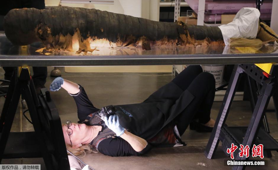 当地时间2014年12月10日,美国芝加哥,菲尔德自然历史博物馆打开了一具拥有2500年历史的古埃及石棺,其中,14岁埃及男孩米尼尔迪斯的裹尸布部分开裂,脚趾露出。