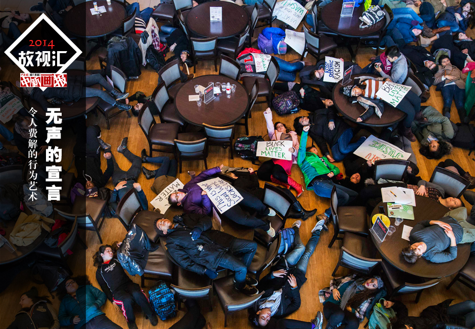 图为当地时间2014年12月1日,美国圣路易斯,学生横躺地面,举行示威活动。自11月24日,美国密苏里州大陪审团宣布不起诉枪杀黑人青年的警察威尔逊后,美国示威者组织了全国性示威活动,为遭枪杀非裔青年布朗寻求公正。