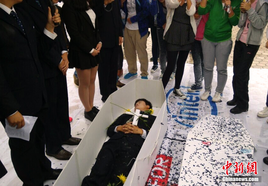 2014年10月20日,郑州,河南工业大学钟楼广场上举行了一场行为艺术葬礼。活动的组织者表示,新学期很多新生都会购买电脑,以“过来人”的经验来看,不少人开始是为了学习,到了后来会沉迷于网络游戏。“我们不能沦为网络的奴隶。正确使用电脑,珍惜大学生活。”他们组织此次行为艺术的目的正在于此。 图片来源:CFP视觉中国