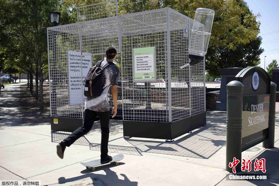 当地时间8月12日,美国丹佛图书馆外、公园等地设置巨型实验室老鼠笼,提醒年龄在12岁到15岁的年轻人远离大麻,避免遭其毒害,成为实验室的小白鼠。这项活动由科罗拉多州州长办公室赞助,斥资200万美元,警醒世人大麻的危害。