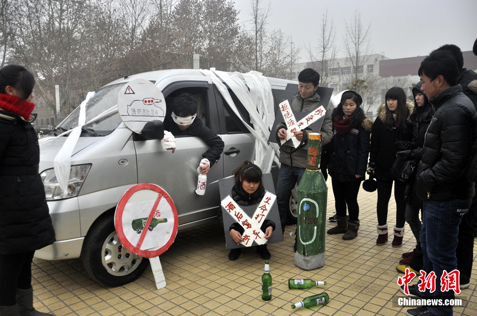 山东聊城大学,大学生志愿者用行为艺术演绎酒驾的危害。随着春节脚步的临近,为提高市民安全出行意识,减少酒驾事故的发生,当日,山东聊城大学美术学院5名志愿者在聊城大学星月广场举办了以“若要亲人勿牵挂,酒后不要把车驾”为主题的社会实践活动。志愿者们用行为艺术演绎酒驾危害,向广大市民更深刻地宣传酒驾的危害。“醉(罪)在酒中, 毁(悔)在杯中”。部分志愿者身缠绷带,手拿酒瓶并戴上酒后驾车生命打折的道具,模拟交通事故现场,触目惊心的场面让大家切实感受到酒驾危害以及醉酒驾驶的严重后果。