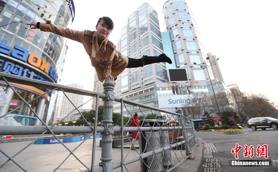 1月26日,南京山西路上,“95后”美女雪儿站上一米多高的马路隔离栏,单手支撑做起高难度动作,引得路人侧目。据了解,雪儿来自辽宁鞍山,希望通过这种行为艺术的表演,在春节即将到来之际,呼吁市民抵制乱穿马路、做文明交通人。她表示,以后每到一个城市她都将进行这样的表演,以个人的微薄之力倡导文明出行。中新社发 泱波 摄