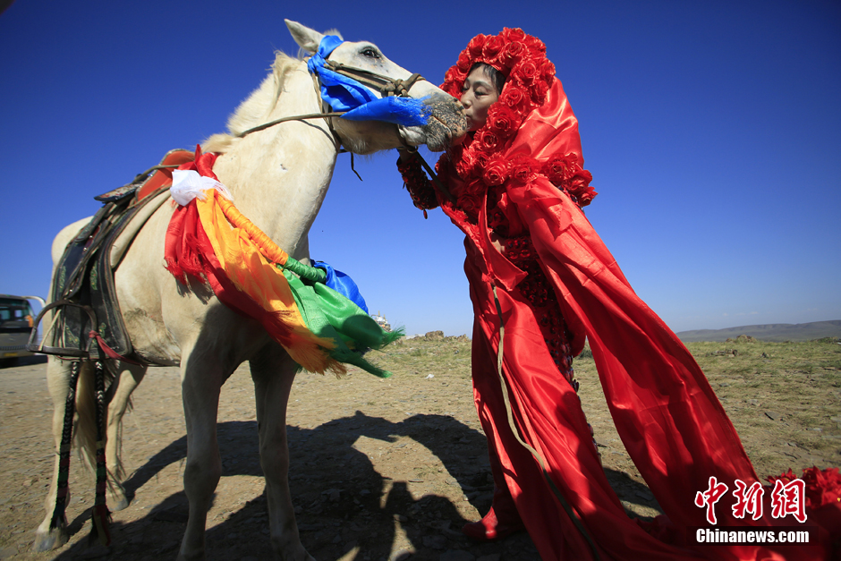 7月26日,艺术家孔宁在内蒙古达茂巴音宝格达与马举行婚礼,为其历经十天的行为艺术《嫁达茂蒙古马》画上完美句号,并成功将其亲手制作的婚纱作品“萨如拉红宝石”献给蒙古马和大草原。吃苦、耐劳、坚韧、勇敢是蒙古马的精神也是草原精神。孔宁牵着白马行走草原表达了对蒙古马永恒的爱,她最终嫁给了蒙古马的精神,也表达了人类追寻蒙古马一往无前的精神。图为孔宁亲吻爱马。中新社发 赵隽 摄