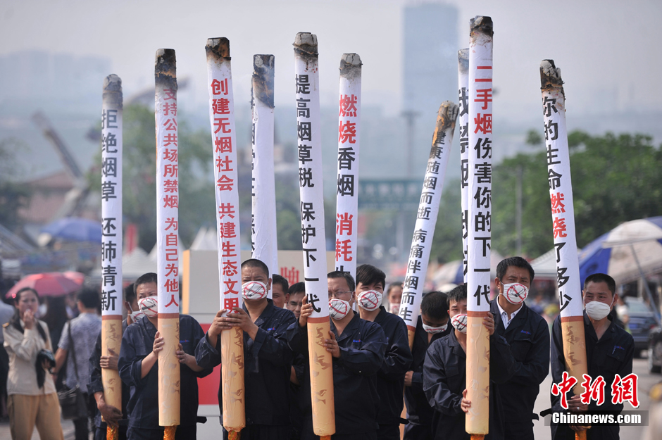 5月30日,重庆洋人街志愿者举着巨型香烟和灭烟托盘提醒市民吸烟有害健康。为呼吁市民创建无烟社会,洋人街工作人员扛着10余支长有近3米,写着“创建无烟社会共建生态文明”、“拒绝烟草还肺清新”、“燃烧香烟消耗生命”等的巨型香烟,并主动要求在街头抽烟的游客灭掉手中的香烟,只要配合灭烟的可获赠一景区自产的特色馒头。陈超 摄
