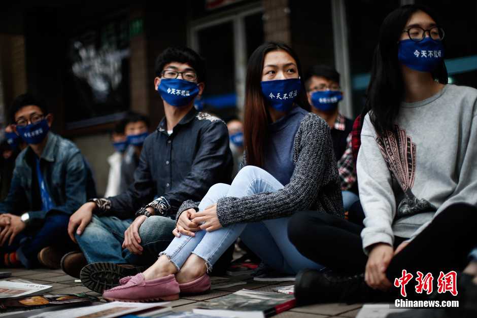 2014年11月23日,由艺术家杨烨炘发起的行为艺术《今天不说话》在上海浦东街头上演,100位参与者戴上口罩,以沉默的方式,呼吁社会支持自闭症群体,唤起人们对自闭症儿童及其家庭的关注和帮助。 图片来源:CFP视觉中国