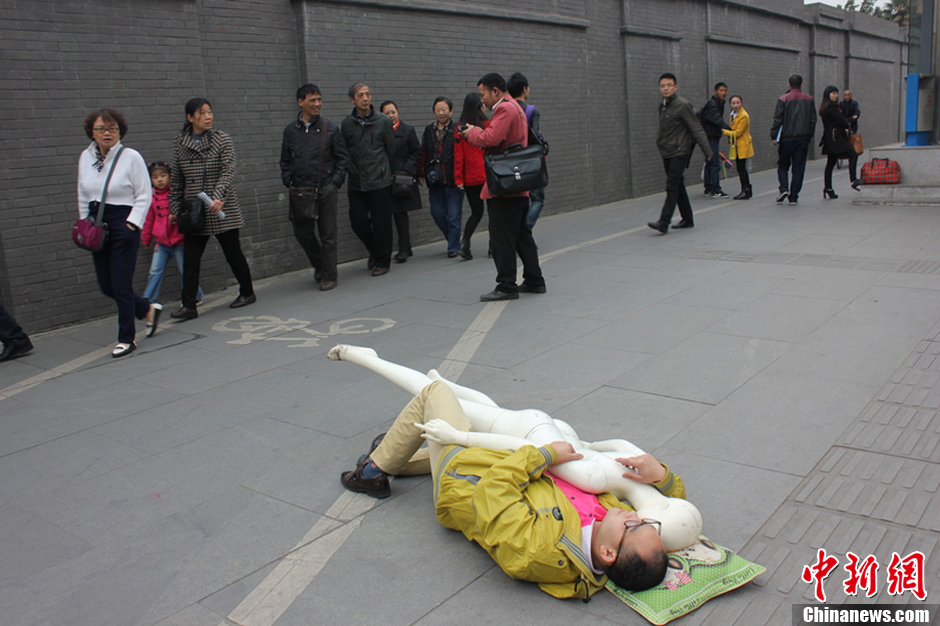 2014年3月20日,成都,一名男子在琴台路进行行为艺术,呼吁关注健康睡眠,吸引路过民众围观。据悉,该男子是一名按摩店老板,平时在工作中听很多客人诉说长期失眠和熬夜,还有很多人有颈椎病,腰椎病,因为3月21日是国际睡眠日,今天做这个街头行为艺术的目的是呼吁大家关注健康睡眠。该男子称,接下来还要到四道街的人才市场、宽窄巷子、人行天桥、地铁口、公交站台去搞行为艺术,呼吁市民关注健康睡眠。李小娟 摄 图片来源:东方IC 版权作品 请勿转载