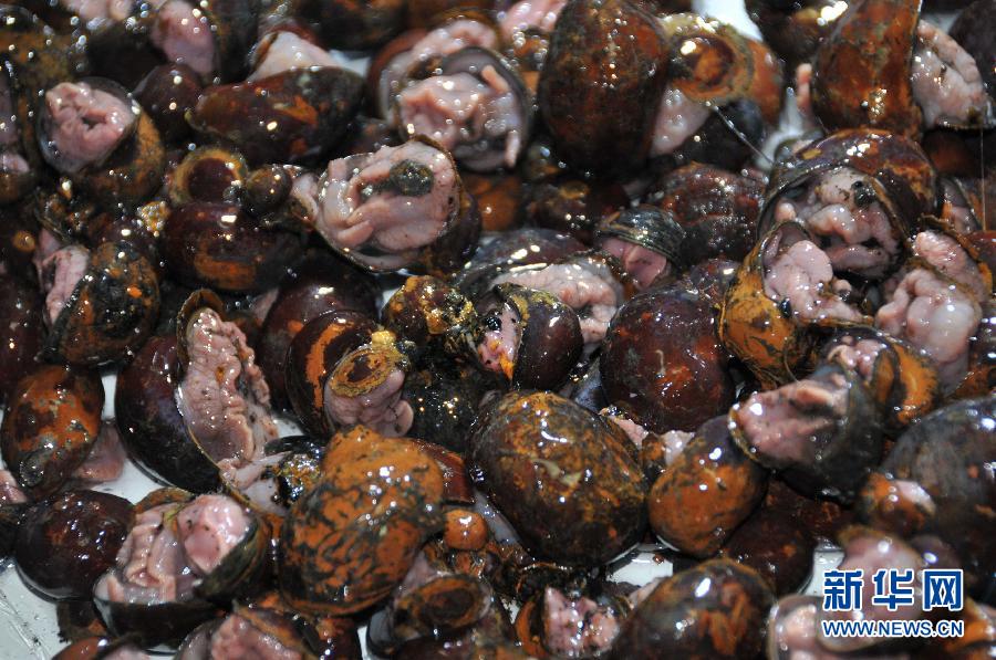 “蛟龙”号载人潜水器采集到的大量海螺(1月11日摄)。 1月11日,中国载人潜水器“蛟龙”号继续在西南印度洋龙旂热液区下潜,采集到大量热液区生物,包括49个贻贝、300多个螺、20多个茗荷和20多个多毛类动物等。新华社记者 张旭东摄