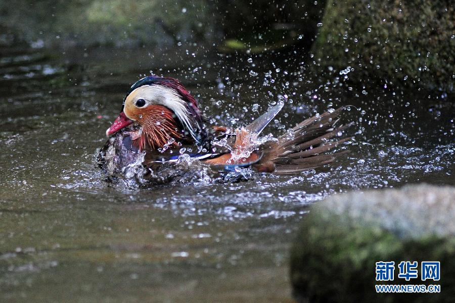 1月21日,在新加坡裕廊飞禽公园,一只鸳鸯在嬉水。