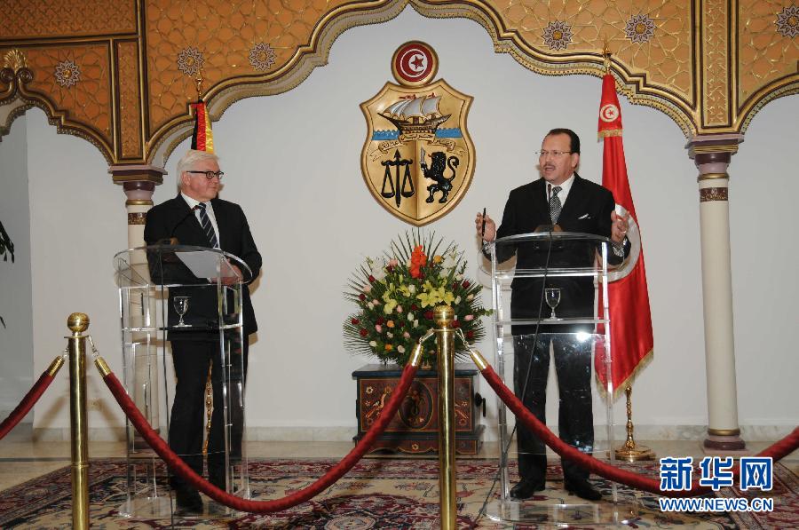 1月23日,在突尼斯首都突尼斯市,德国外长施泰因迈尔(左)与突尼斯外交国务秘书费萨尔·齐亚举行新闻发布会。当日,德国外长施泰因迈尔访问突尼斯。 新华社发(阿代尔摄)