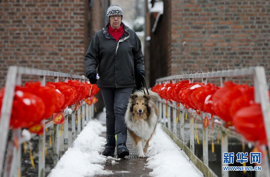 1月24日,在比利时东部小城特镇,一位当地居民牵狗从装饰有红灯笼的桥上走过。当日,比利时特镇国际艺术双年展在东部小城特镇开幕。主委会将本届双年展定为“中国年”,约2万个纸制红灯笼将小镇装饰一新,充满浓浓的中国风情。新华社记者 周磊 摄
