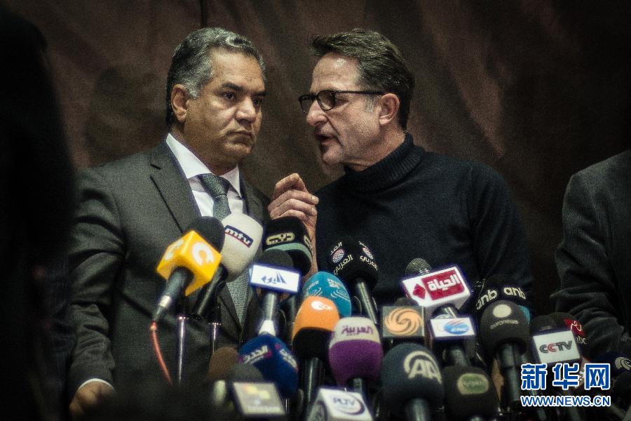 1月24日,在埃及首都开罗,埃及文物部长马姆杜·达马蒂(左)与德国文物专家克里斯蒂安·埃克曼在新闻发布会上交谈。当日,埃及文物部长携德国文物专家在埃及博物馆召开新闻发布会,就“图坦卡蒙黄金面具受损”作出回应,称修复面具时所用的粘合剂可通过精细手段去除,黄金面具“无实质性伤害”。新华社记者潘超越摄