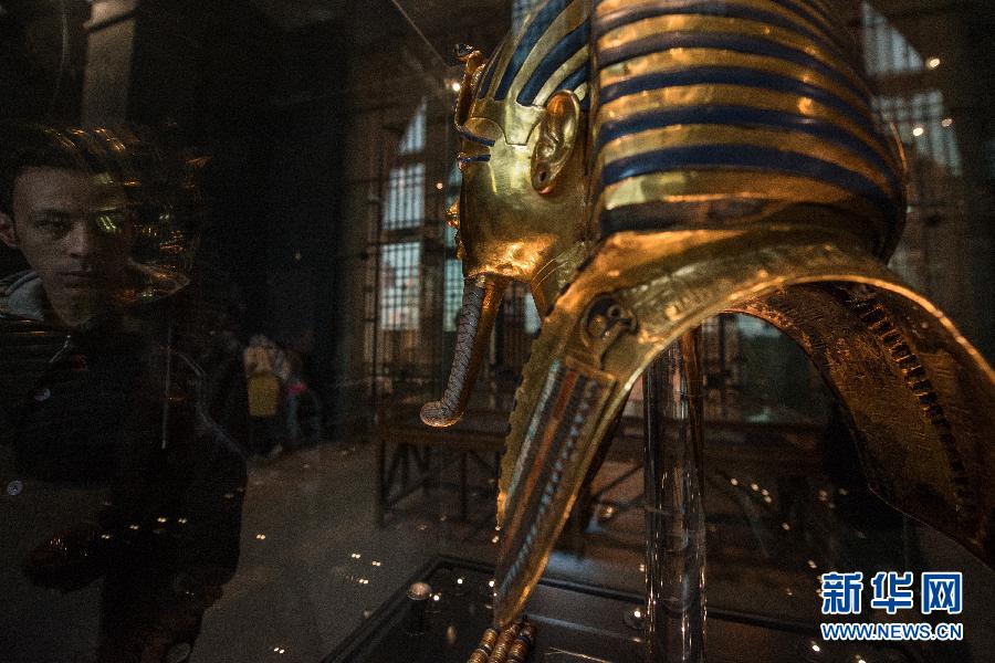 1月23日,在位于开罗的埃及博物馆,一名工作人员透过玻璃柜查看图坦卡蒙黄金面具。新华社记者潘超越摄