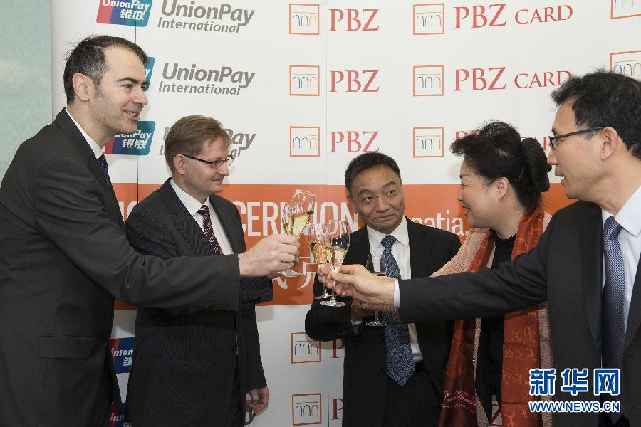 1月26日,中国银联总裁时文朝(中)、中国驻克罗地亚大使邓英(右二)、克罗地亚萨格勒布经济银行(PBZ)执行董事兼银行卡监事会主席卢契奇(左一)和联合圣保罗卡公司(ISPC)总裁豪斯尔(左二)在克罗地亚首都萨格勒布出席合作协议签字仪式。当日,银联国际分别与PBZ和ISPC签署银联卡受理合作协议。根据协议,PBZ将在今年一季度开通其旗下所有ATM和商户受理银联卡。这是银联卡首次登陆克罗地亚市场。同时,ISPC将逐步开通其所服务的中东欧市场机构受理银联卡。 新华社发(米绍·利沙宁摄)