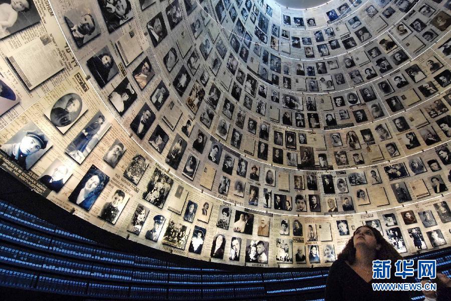 2007年1月28日,在耶路撒冷的亚德韦希姆大屠杀纪念馆,悼念者仰视墙上悬挂的被纳粹屠杀的犹太人照片。 新华社记者郭磊摄(张晨岑编辑)
